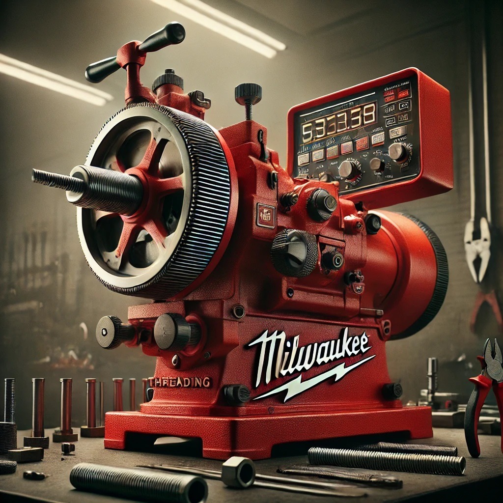 A Milwaukee threading machine cuts threads into pipes using a rotating die head. The machine grips the pipe securely while the die head rotates and cuts the threads.