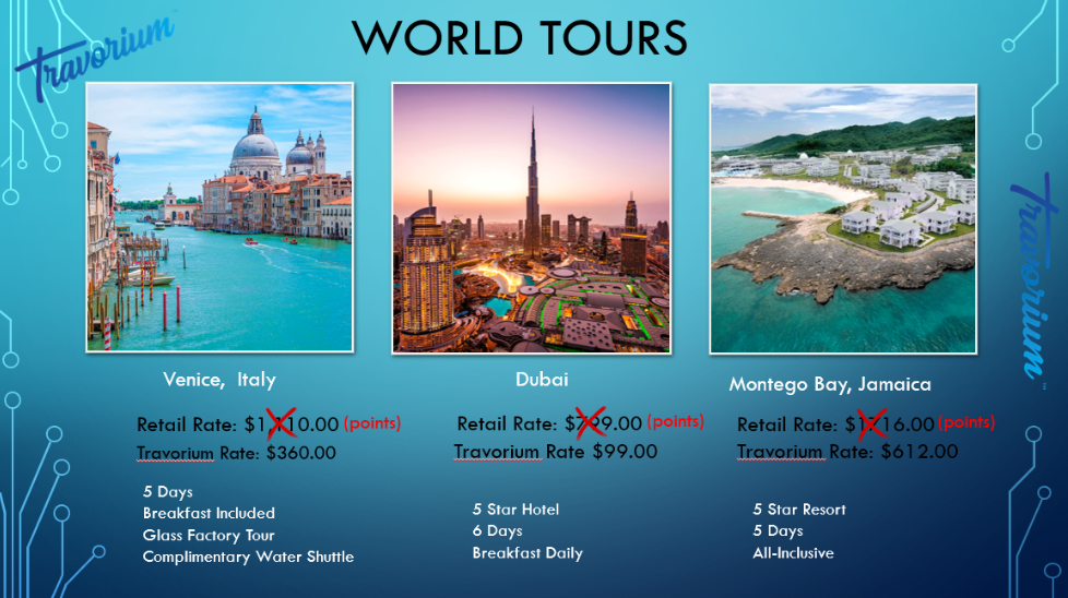 - Membership payment: After 14 days of being a member with Travorium you receive a complimentary trip from 4 to 8 days, depending on the country, where you only pay taxes, typically ranging from $50 to $350 on average. Most importantly, you gain access to a hotel database and a system of 5 platforms where you can book hotels, resorts, cruises, tours, excursions, rent cars, and purchase airline tickets worldwide at discounted rates anytime and as often as you like.
