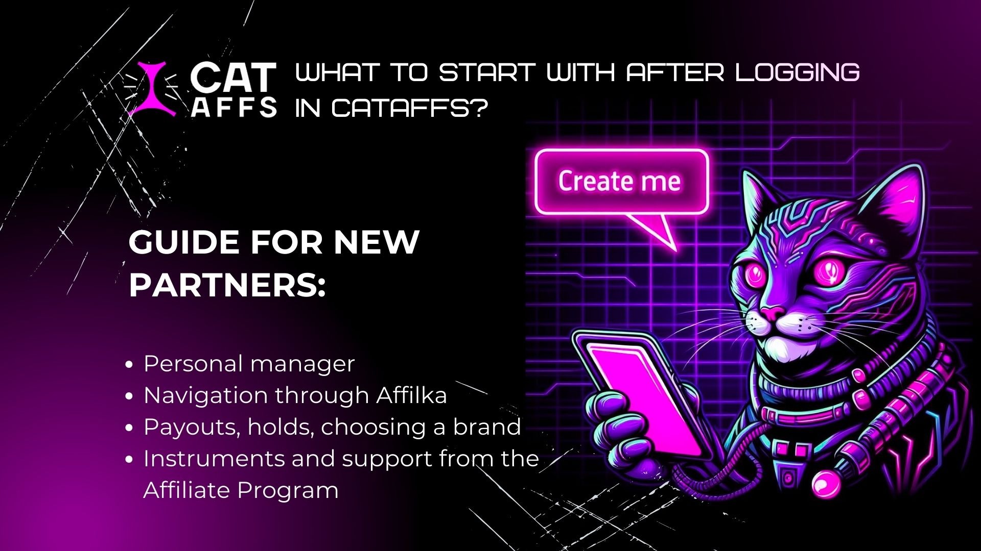- Affiliate program. This section contains information about your partnership with CatAffs. Here you will find work models, rates, contacts, rules and affiliate guidelines.