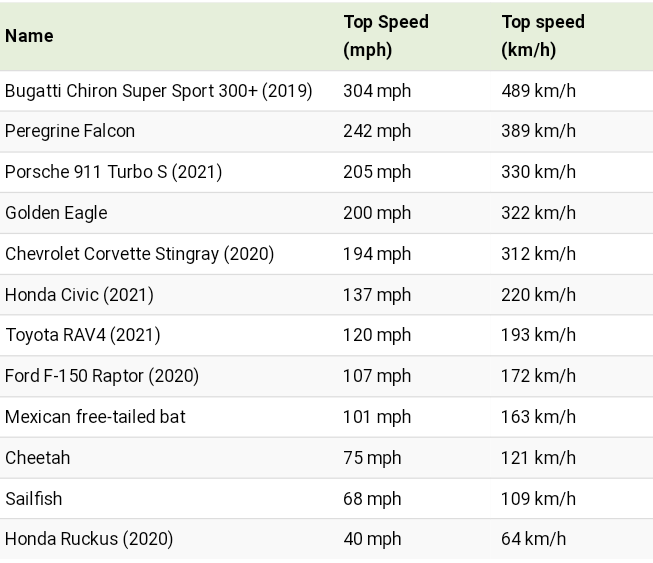 In this graphic, we’ve visualized the top speeds of several animals and cars to show you how close the race really is. The data we used is also listed below in tabular format.
