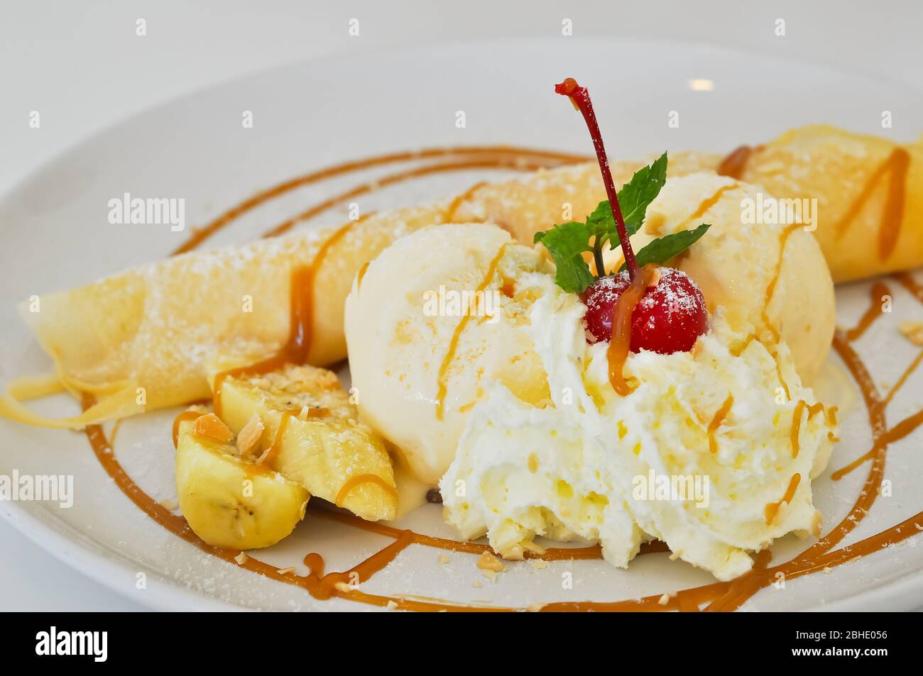 Beat the cream cheese, sugar and vanilla until smooth . Then mix in the pre-made (or store bought) whipped cream . Mix just until smooth . Spread on top of crepes and add desired toppings .
