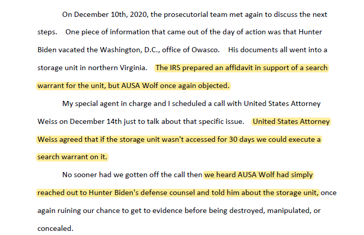 The sabotage of the investigation would continue. InDecember 2020, that same AUSA blocked a search warrant for all documents in Hunter Biden’s storage unit. She then “reached out to Hunter Biden’s defense counsel and told him about the storage unit,” potentially allowing a target of a criminal investigation to remove evidence of those crimes before the search was conducted.