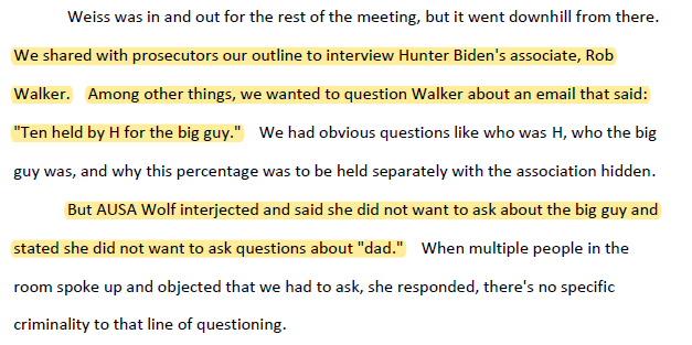 After the 2020 election, investigators wanted to question witnesses about an e-mail that said “Ten held by H for the big guy.” The AUSA “said she did not want to ask about the big guy and stated she did not want to ask questions about ‘dad’”. She ignored objections from agents and investigators, and provided a false limitation to what investigators could ask.