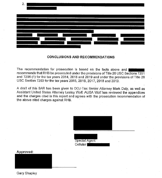 Yet agents and analysts continued to obtain evidence supporting numerous charges against Hunter Biden. By 2022, there was support for “charging Hunter Biden for tax evasion and false return in 2014, 2018, and 2019, and failure to file or pay for 2015, 2016, and 2017.” (The tax liability was estimated by Shapley to be around $2.2 million.) The DOJ Tax Division then authored a 90+ page memo (that included thousands of pages of evidence) that recommended prosecution. Here’s an excerpt from that memo’s conclusions:
