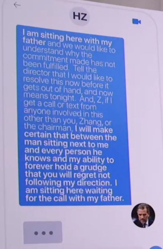 One such text, released today, was sent by Hunter Biden via WhatsApp on July 30, 2017. It threatened Henry Zhao (a Chinese Communist Party official and CEO of Harvest Fund Management) with retaliation for not fulfilling a financial commitment. Former Vice President Joe Biden was said by Hunter to be ready to assist with that retaliation. Read it in full: