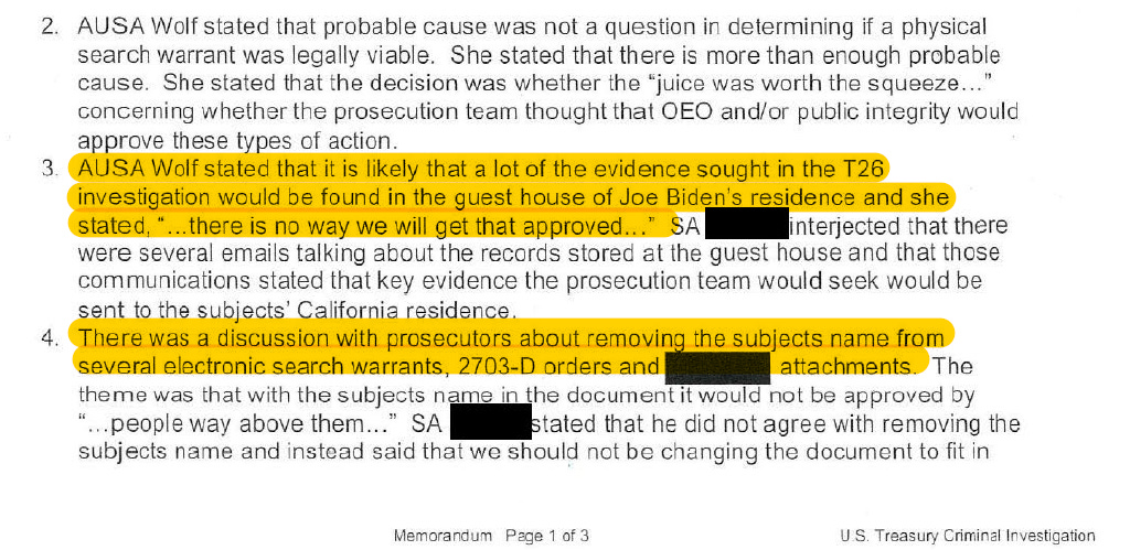 In September 2020 meeting, one Assistant US Attorney (AUSA) conceded that “a lot of evidence in our investigation would be found in the guest house of former Vice President Biden” but said there was no way a search warrant would be approved. (It appears that search warrant was never approved after Biden’s election.) Treasury records completed around that time confirm the conversation.