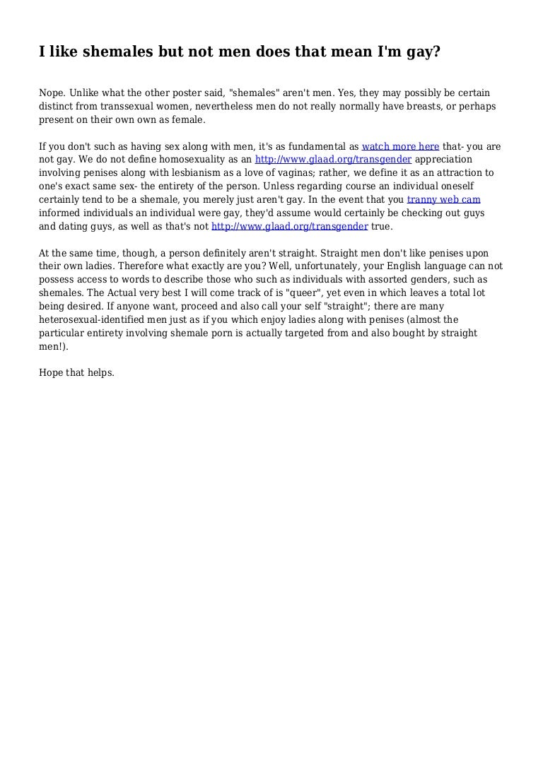 Now I will say, I actually do, I only like when it's a shemale and woman though . It doesn't make you gay . If you like shemales then you are obviously attracted to feminine bodies, just because she has a little more between her legs . If it's only a shemale with a woman then it's fine and not gay, it's actually quite common