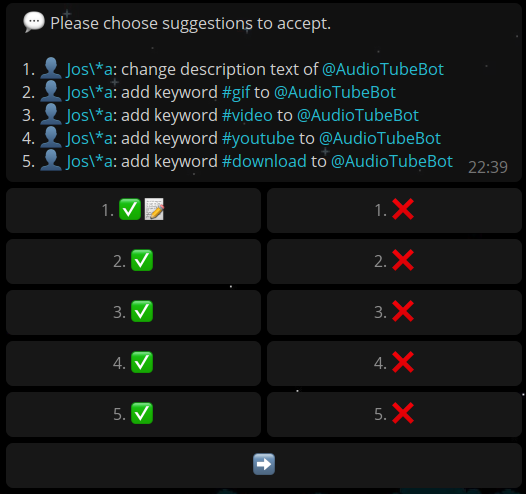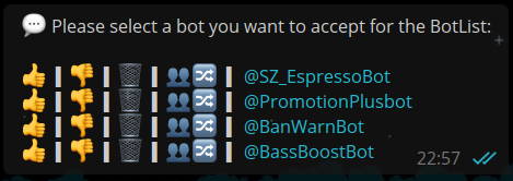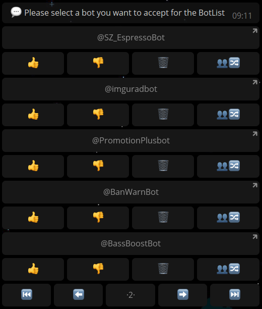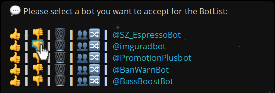 "https://t.me/botlistbot?start=thumb_down_imguradbot" and immediately edit the message according to the developer's conception. In this case, the bot submission @imguradbot would be rejected from inclusion on the @BotList, a notification sent to the submittant, and the message be edited to display the remaining options:
