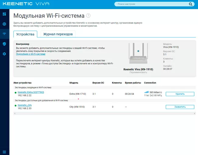 Поддержка Mesh Wi-Fi (подключение ретрансляторов по Wi-Fi ) на все двухдиапазонные модели 2 .4 / 5 ГГц (Giant, Giga, Ultra, Viva, Extra, Air, City, Duo, Speedster, Hero 4G) была добавлена начиная с версии KeeneticOS 3 .1 .