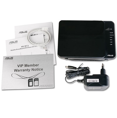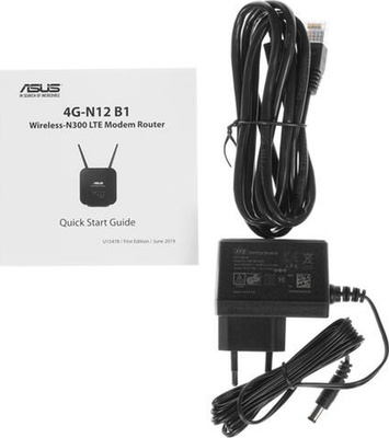 Package content . - 4G-N12 B1 Wi-Fi LTE router . -2 x detachable LTE antennas . -1 x RJ45 cable . -Quick Start Guide . -Power adapter . -Warranty card .