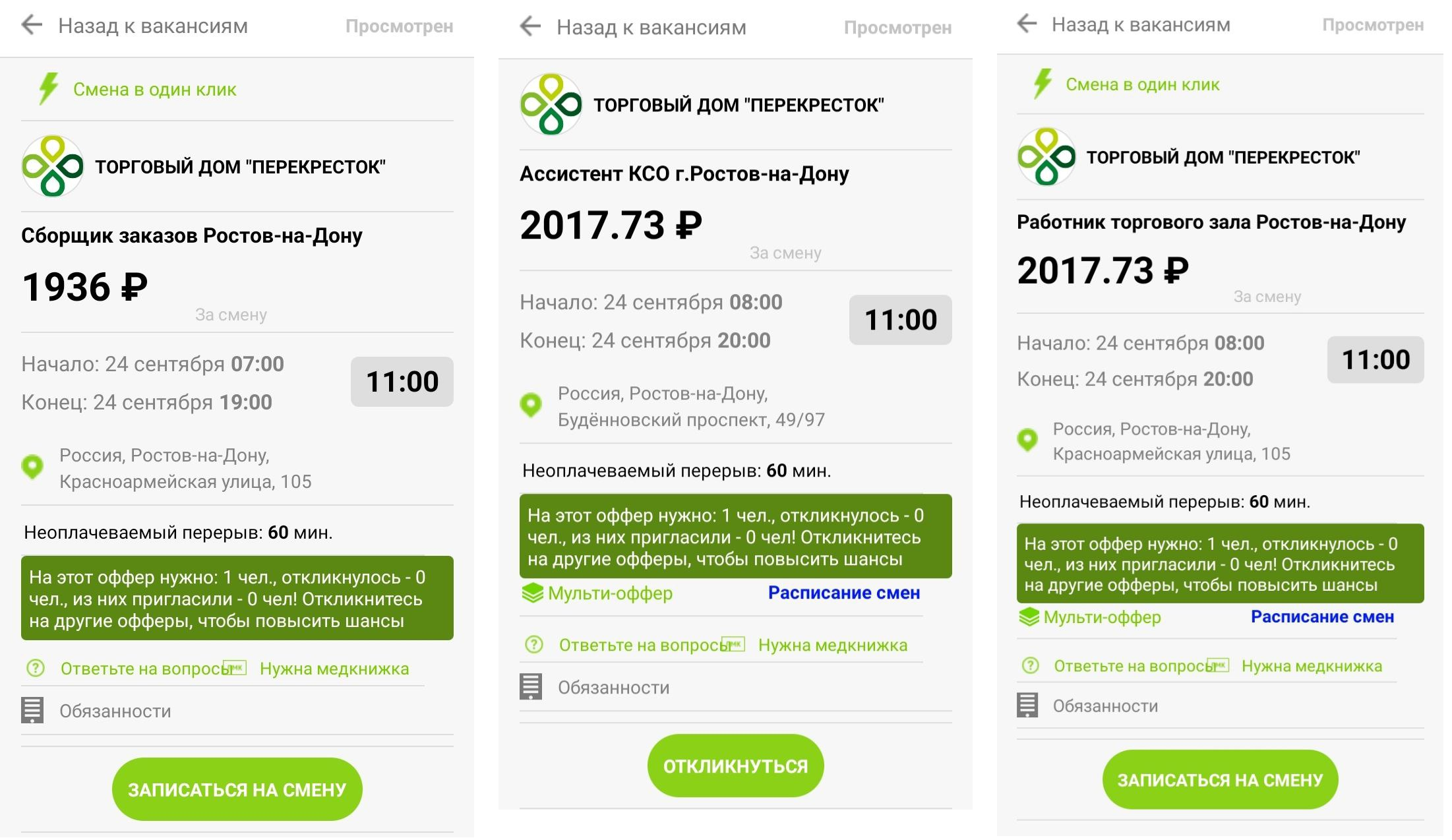 В карточке есть информация о времени, оплате и обязанностях. Чтобы записаться на смену, надо нажать зеленую кнопку.