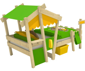 Kinderhochbett Wickey CrAzY Hutty mit schräger Hütte . CrAzY Hutty, so heißt die geheime Zauberhütte im großen Märchenwald, welche die kleinen Hexen und Zauberer nur im fliegenden Auto durch den Wegweiser erreichen . Dort angekommen, kaufen sie an der Ladentheke leckere Zaubertränke und klettern an der Sprossenleiter hoch auf das magische Bett . An jenem Ort wird das Hexenbuch ausgepackt und die spannendsten Zaubersprüche ausprobiert .