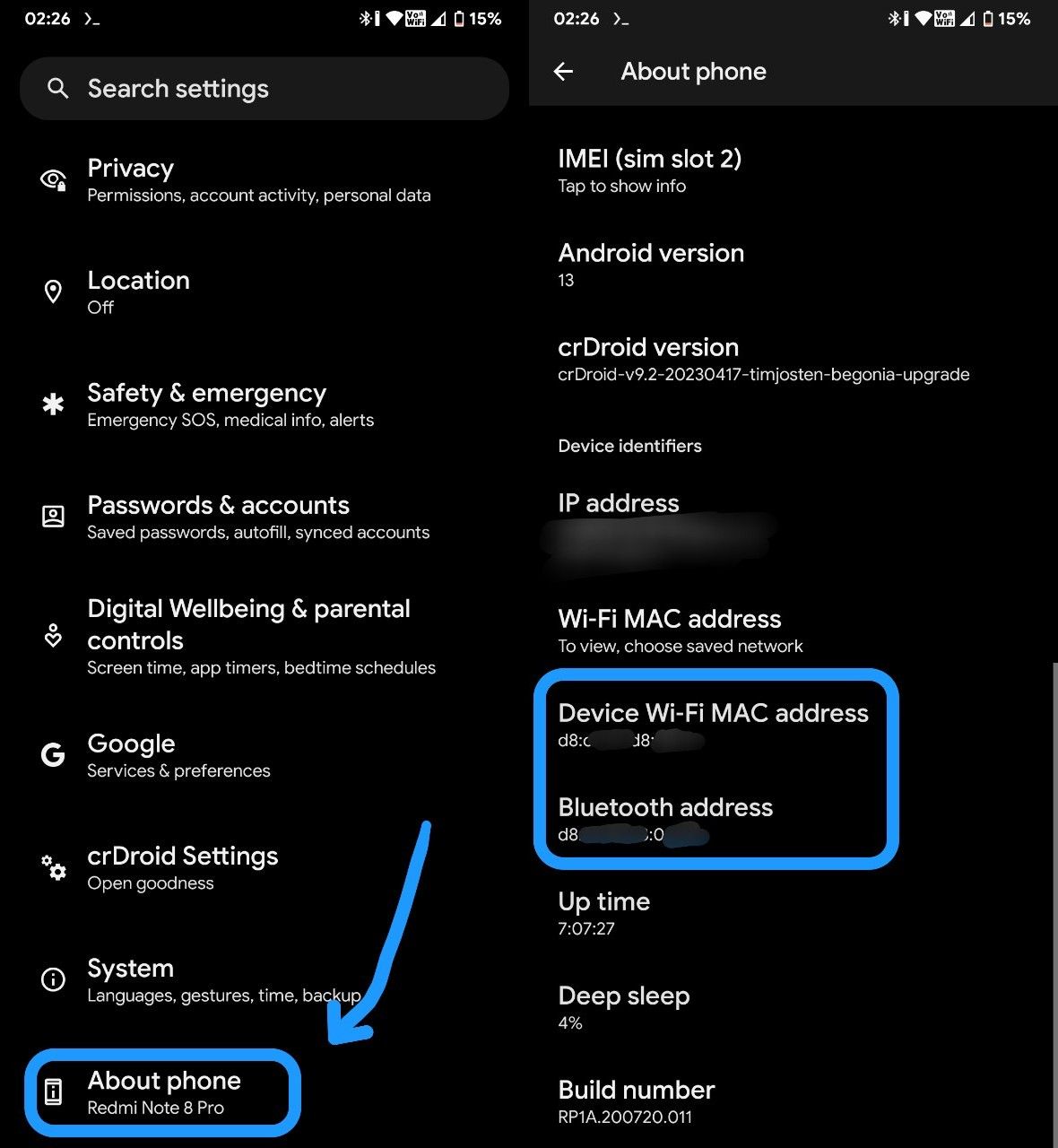 Go to Settings, scroll all the way down, click on "About Phone". You'll find both Device and Bluetooth macs here. You need to be connected to WiFi and Bluetooth to get the values.