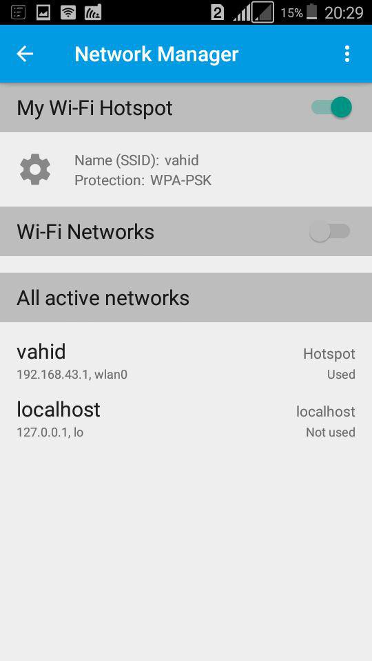 و همچنین در حالت هات اسپات با فعال کردن Mobile Hotspot دستگاه اندرویدی شما تبدیل به یک مودم وایرلس میشود و کافی است تا طرف مقابل به هات اسپات شما متصل شود تا این ارتباط رایگان برای چت کردن و تماس برای شما ممکن شود.