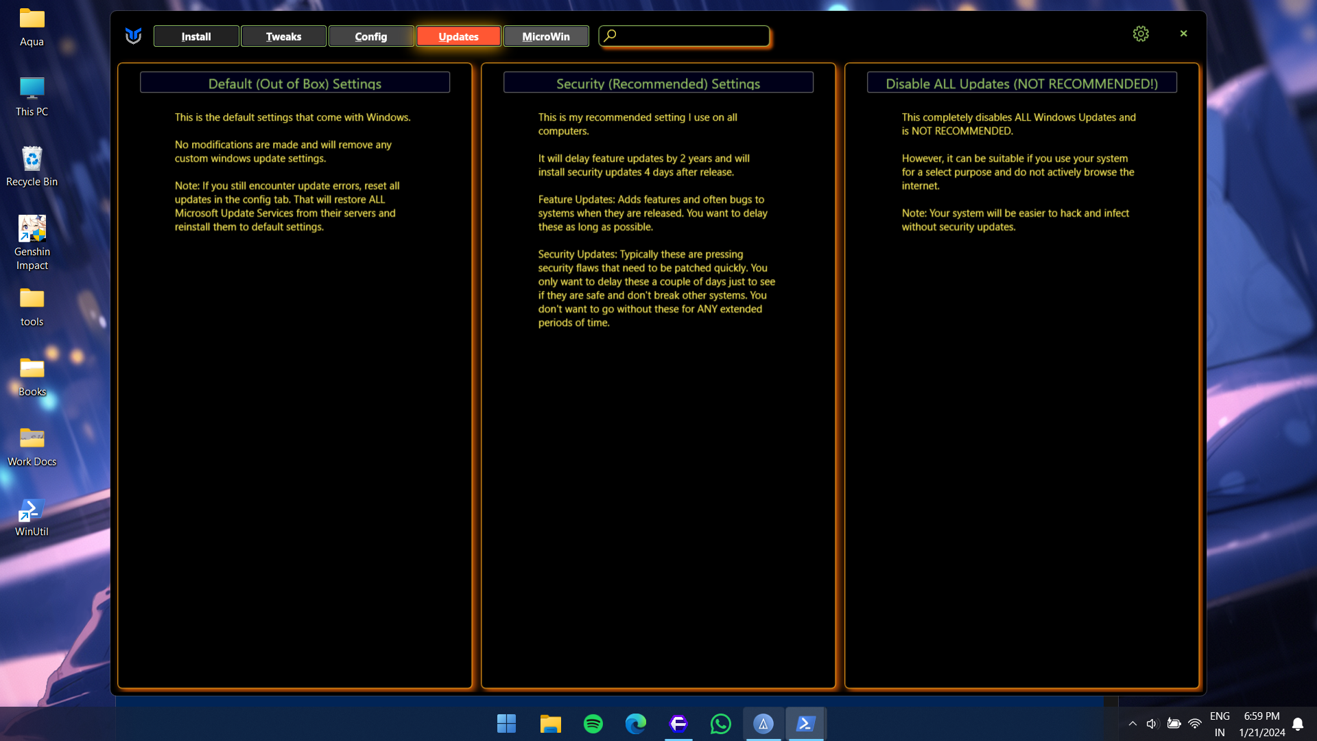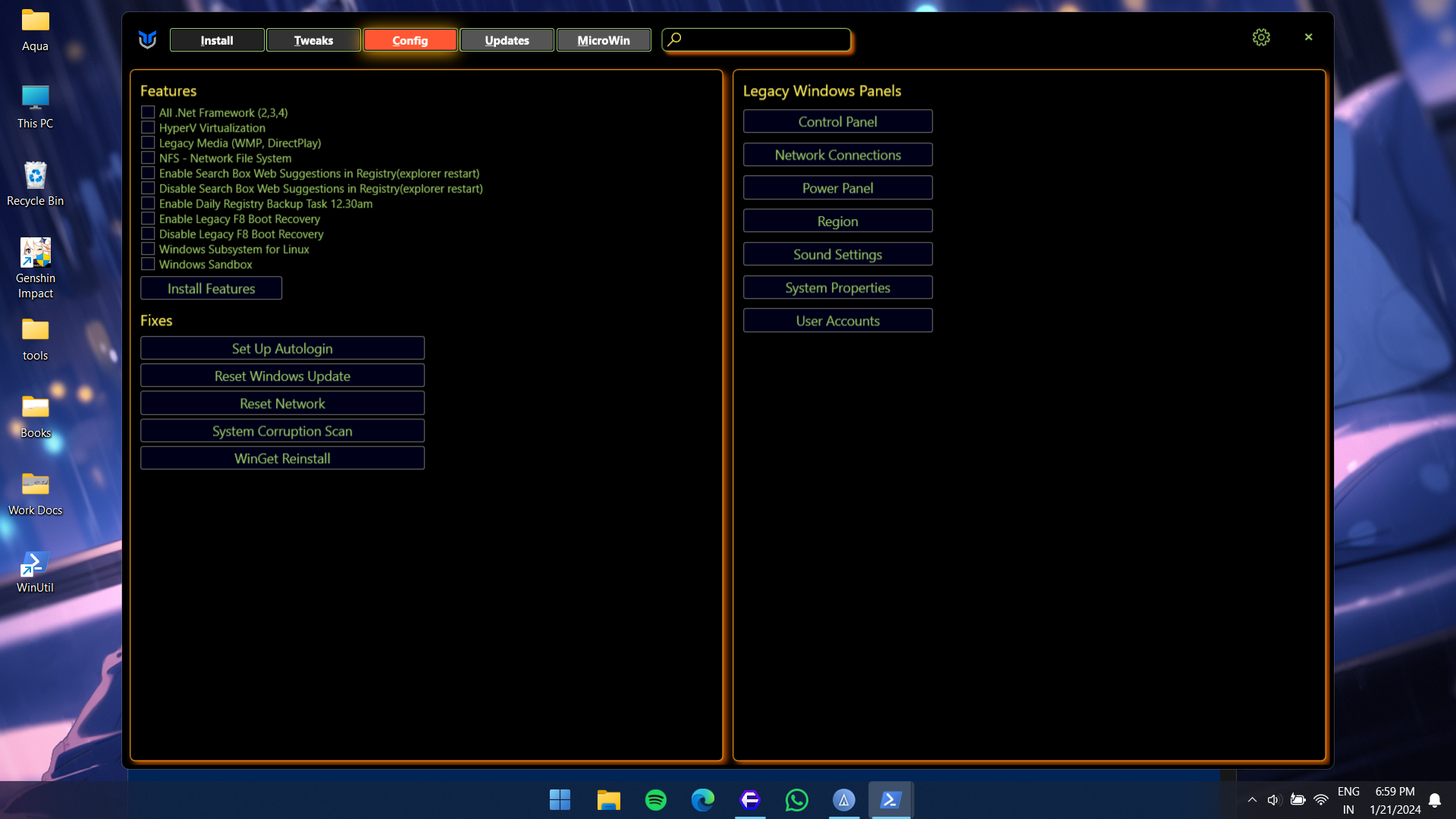 Windows UtilityAquaHere are some quick snaps of how the tool looks:Batch installation of appsSome tweaks for the windows system Configuration of features and some fixesWindows updater settings MicroWin: An windows ISO modification tool