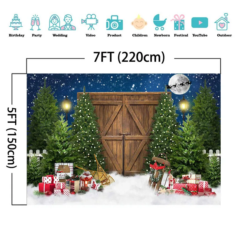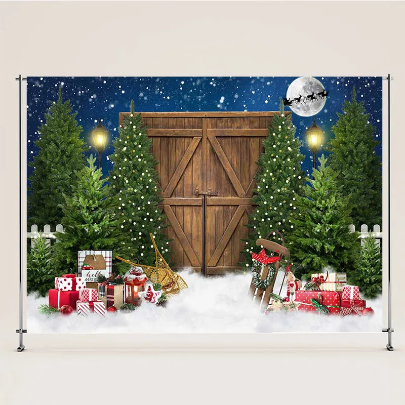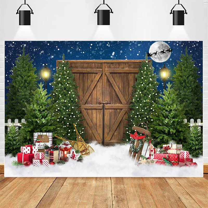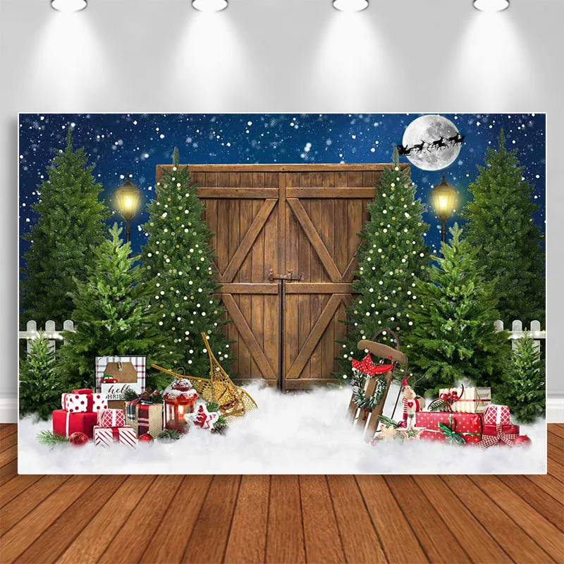 "Winter Christmas Night Backdrop Rustic Wooden Barn Door Photoshoot Xmas Tree Gift Decor Kids Portrait Photography Backgrounds" * Buy Now Just For 38$