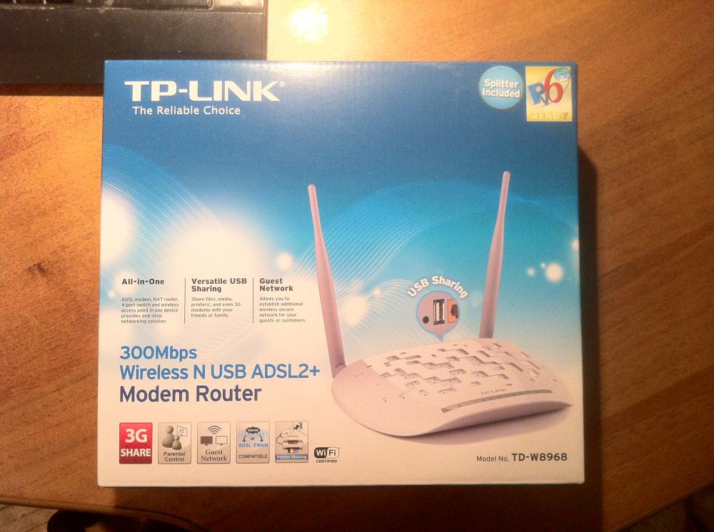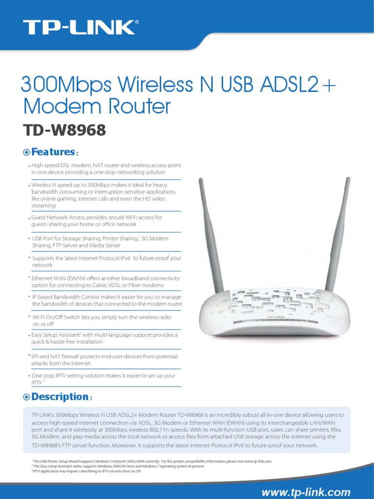 TP-LINK's TD-W8968 300Mbps Wireless N USB ADSL2+ Modem Router is an incredibly robust all-in-one device allowing users to access high-speed internet connection via ADSL or Ethernet WAN (EWAN) using its interchangeable LAN/WAN port and share it wirelessly at 300Mbps wireless 802 .11n speeds . With its multi-function USB port, users can share printers, . . .