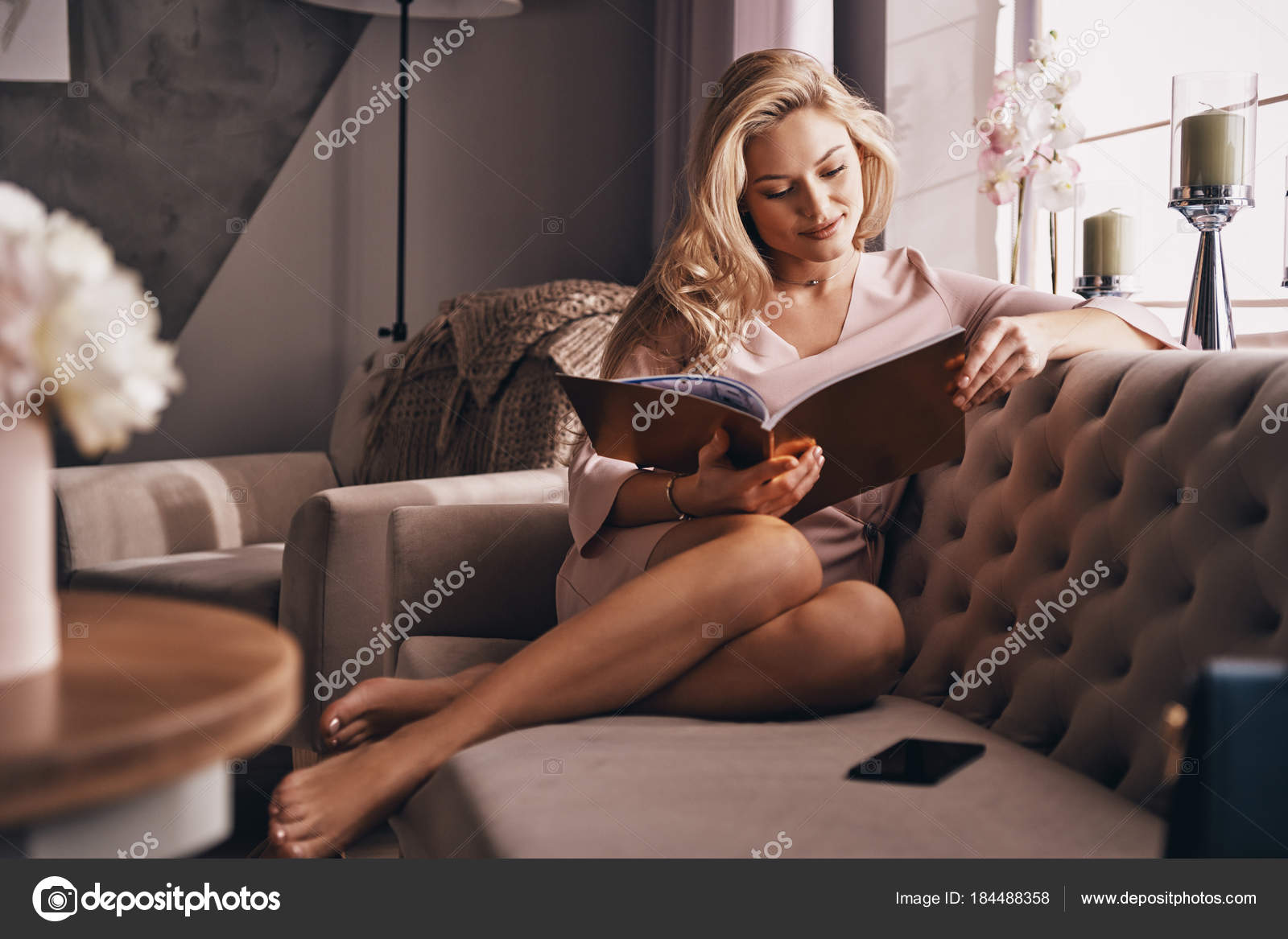 Woman reading vogue showing feet