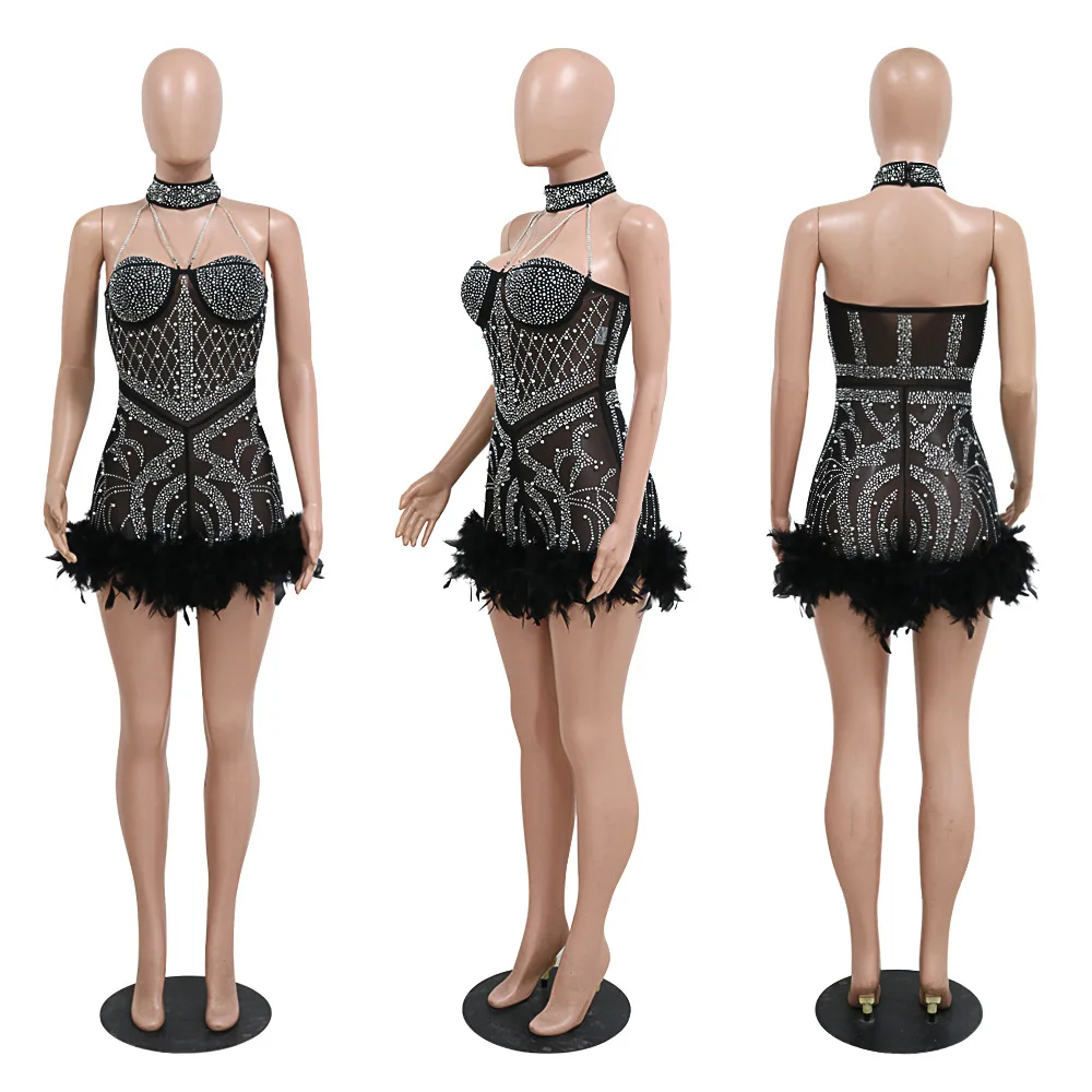 SqGKnYlZCHere you can buy Women Design Solid Color Feather Patchwork Rhinestone Jumpsuits Fashion Evening Gorgeous Halter Neck Crystal Sexy Mesh Jumpsuits with free delivery to your post office.