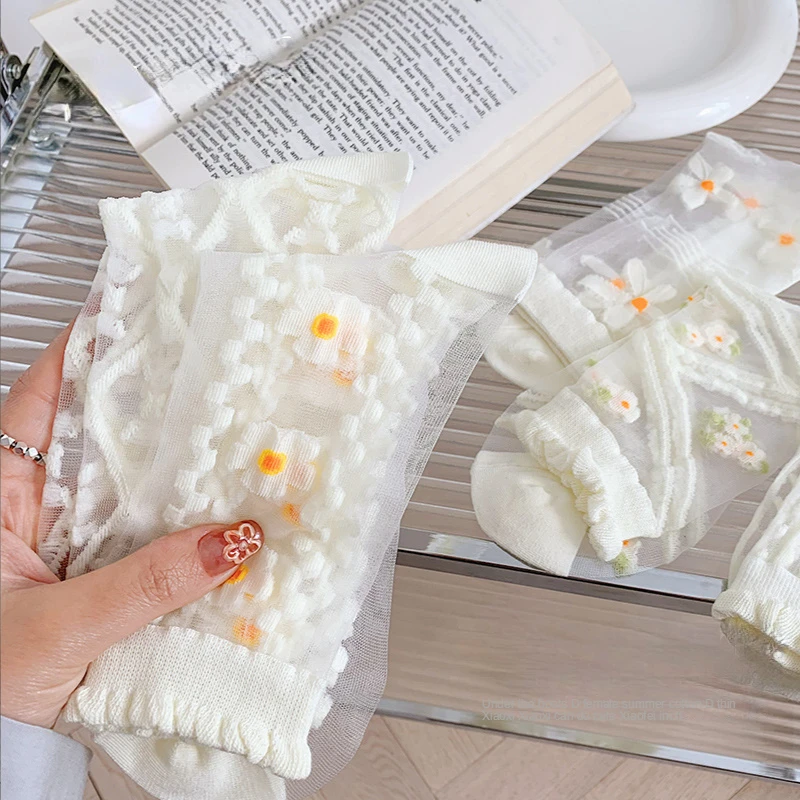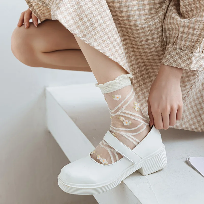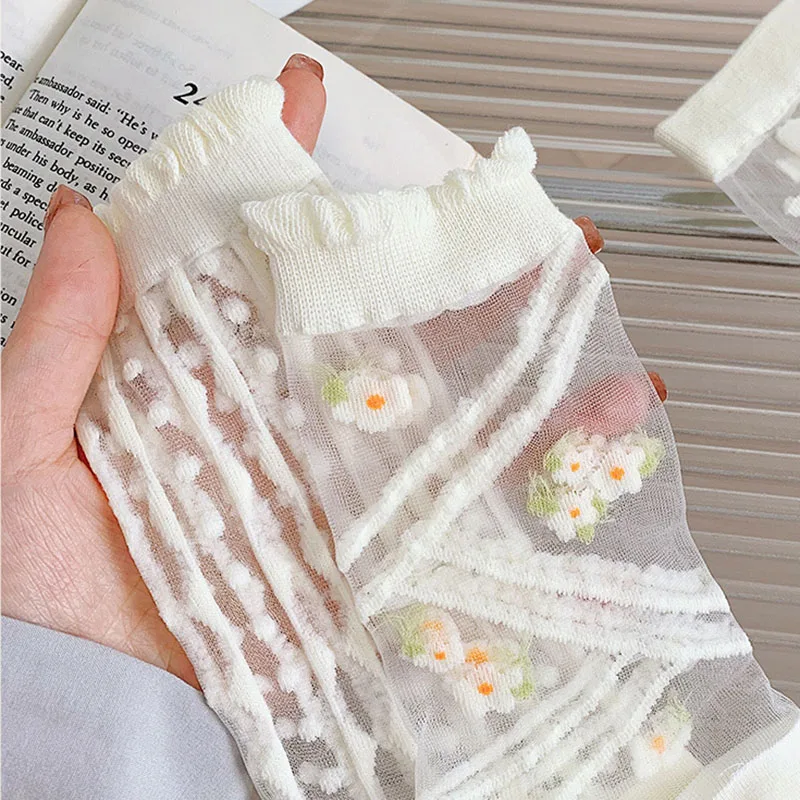 "Women Socks White Crystal Silk Socks Fashion Flowers Thin Medium Tube Glass Silk Girls' Socks Casual Transparent Student Socks" * Buy Now Just For 3$