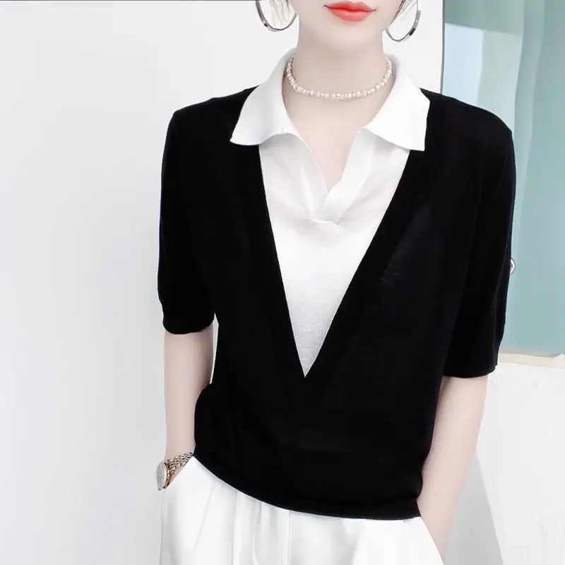 gYgKhFKbXДолго искали Women Solid Loose Knit Sweaters Spring Summer POLO Collar Short Sleeve Patchwork Fake Two Piece Fashion Female Casual Pullovers, но не могли найти? Предоставляем вашему вниманию Women Solid Loose Knit Sweaters Spring Summer POLO Collar Short Sleeve Patchwork Fake Two Piece Fashion Female Casual Pullovers по лучшей цене на рынке!