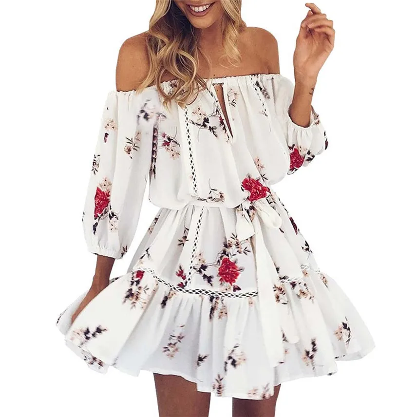 New Women Boho Short Sleeve Floral Print V-Neck Ruffle Mini Dress A-Line Summer Holiday Sundress with Belt Vestidos De Festa