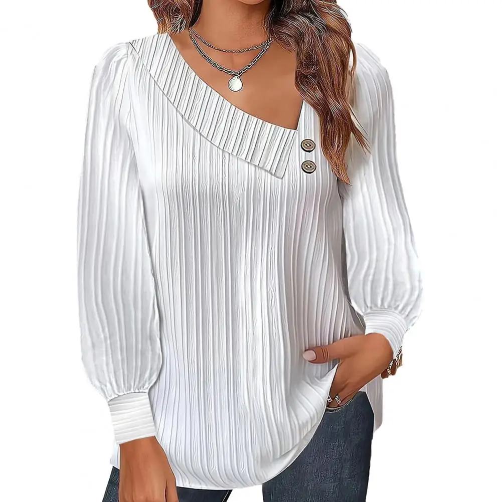 Women Top Oblique Neck Button Decor Lantern Sleeve Solid Color Pullover Soft Breathable Lady Fall Spring Commute Blouse - Купить с бесплатной доставкой