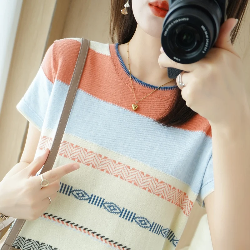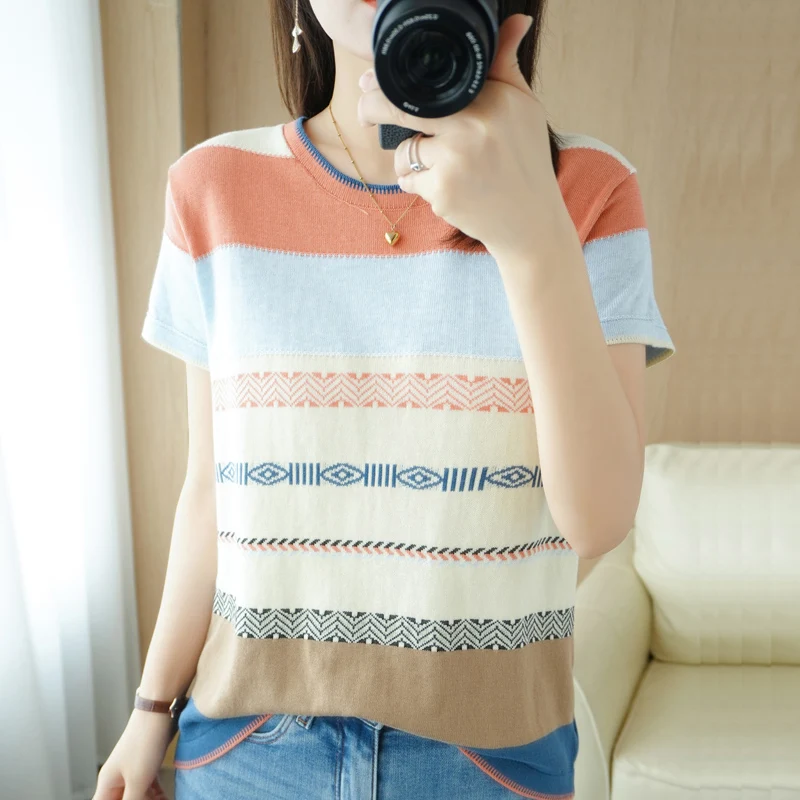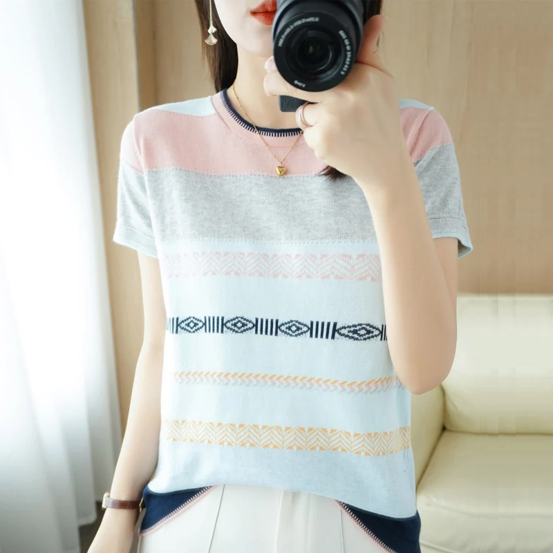 «Women's Sweater Pure Cotton Knit Round Neck Color Contrast Stripe Versatile Short Sleeve With New Spring Autumn Underlay Fashion» по лучшей цене на рынке! Всего за 20$ (1900рублей)
