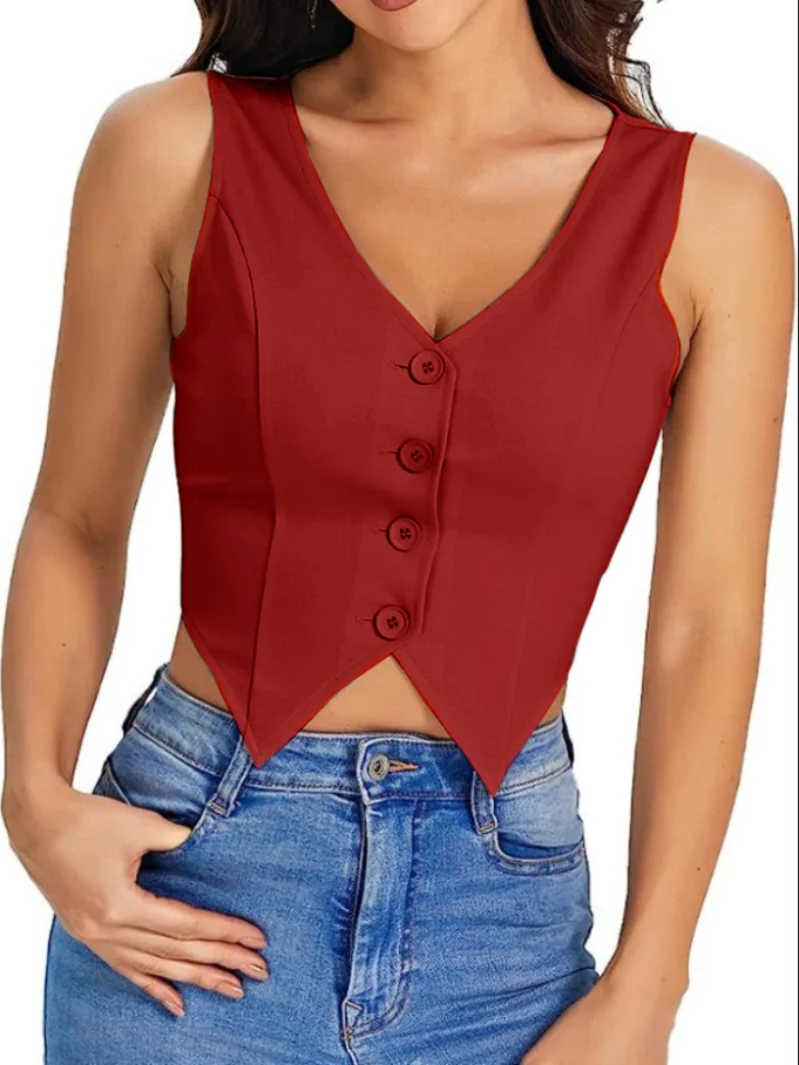 "Women's Vest V Hem Button Front Drawstring Short Jacket V Neck Sleeveless Solid Color Simple Wide Shoulder Strap Blazer Top" * Buy Now With Free Shipping Just For $16