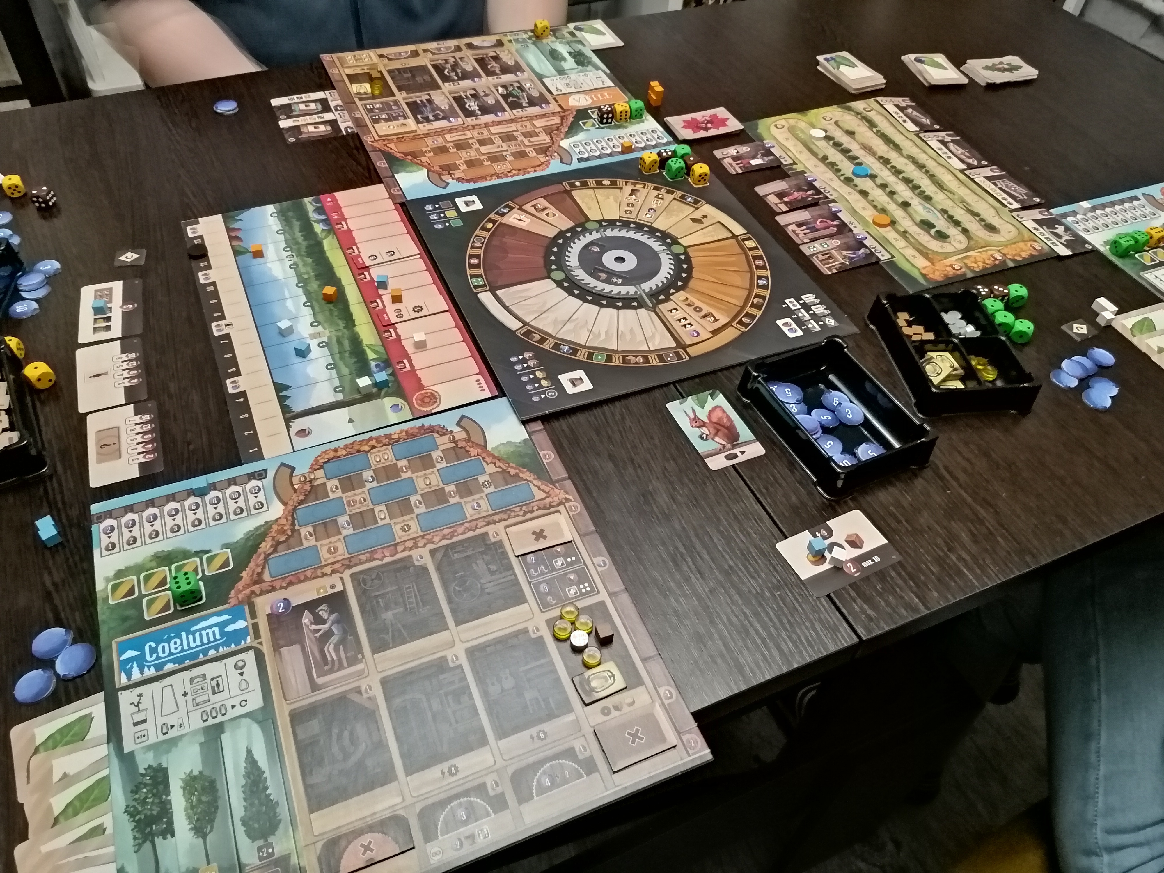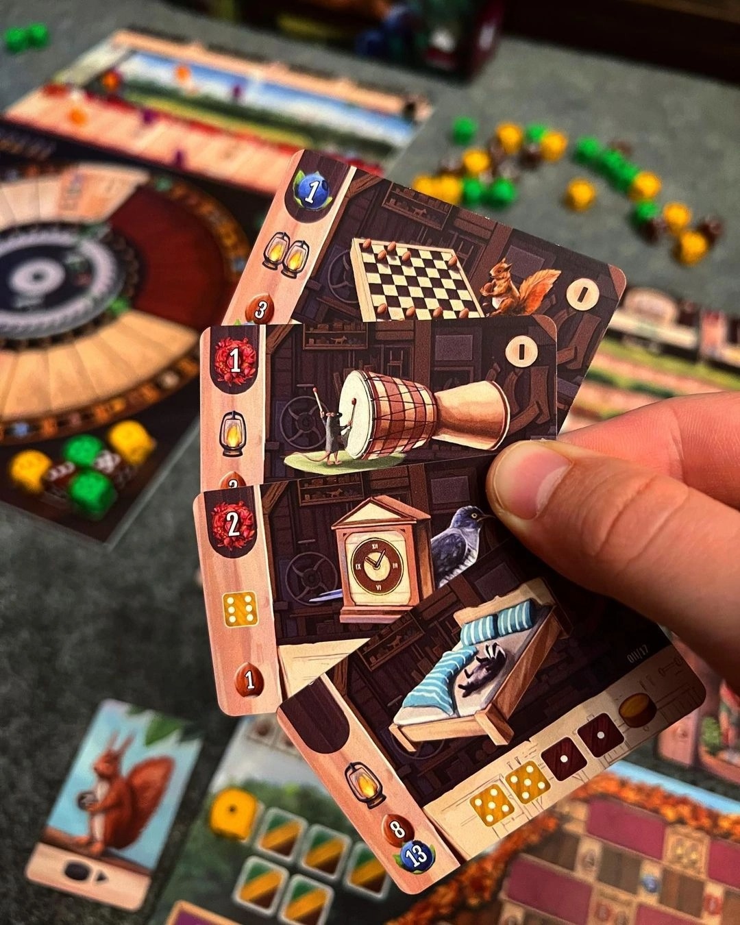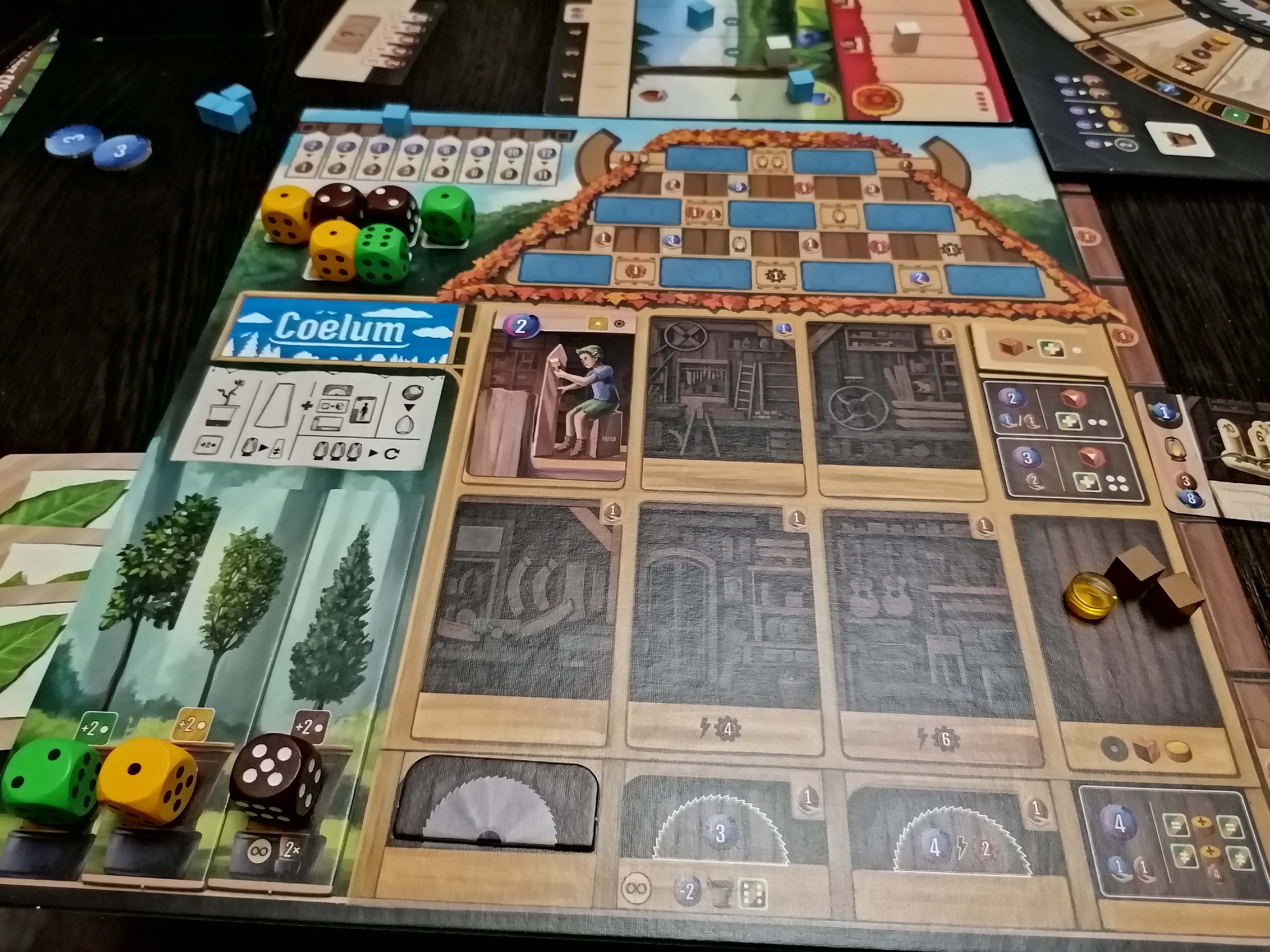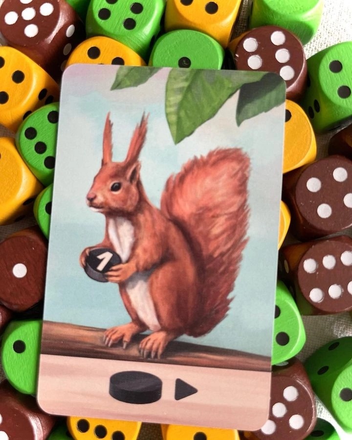 Вторая фишка игры - зелёные, жёлтые и коричневые кубики, представляющий собой ресурс древесину. Это основные штуки, над чем мы будем работать. Бросать кубики мы здесь не будем, нет)) Зато будем их распиливать (делить на два таких же в любом суммарном сочетании значений), сращивать (прибавлять значения), склеивать с другими (суммировать значения) или вообще сажать в горшок, чтобы значение кубика росло в каждом раунде на 2.
