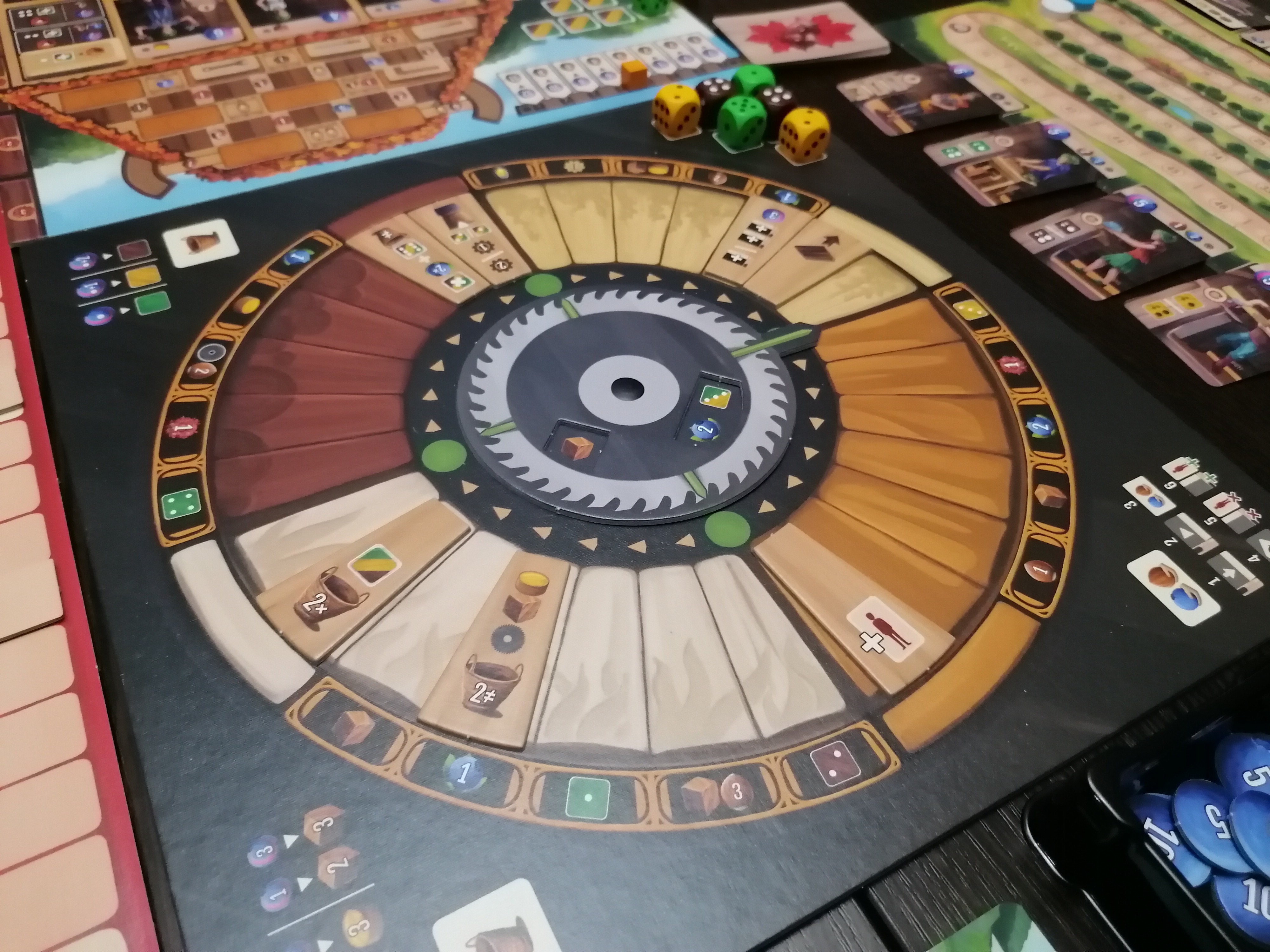 Одной из основных фишек игры является планшет действий. На нём есть вращающаяся циркулярная пила и 7 плашек действий (купить древесину, продать древесину, улучшить мастерскую, нанять помощника, взять контракт, купить материалы). Основной ход игрока заключается во взятии одной из таких плашек, выполнении её действия и перекладывании плашки в следующий сектор циркулярной пилы.