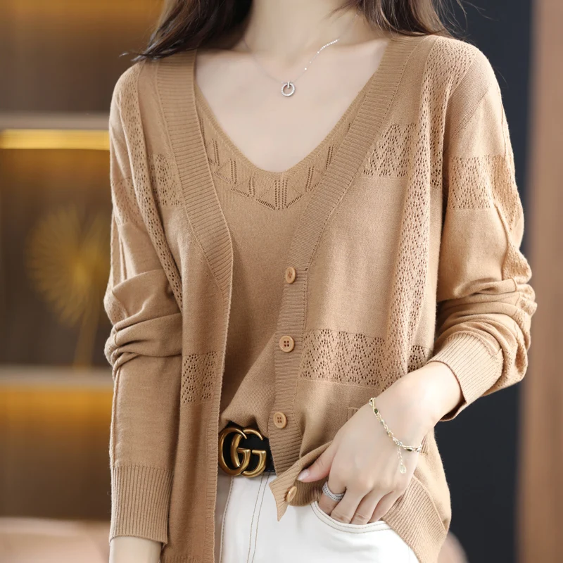 «Wool Cardigan Women's V-Neck 2022 Spring And Summer New Thin Hollow Jacket Solid Color Commuter Long-Sleeved Allmatch Large Size» по лучшей цене на рынке! Всего за 28$ (2660рублей)
