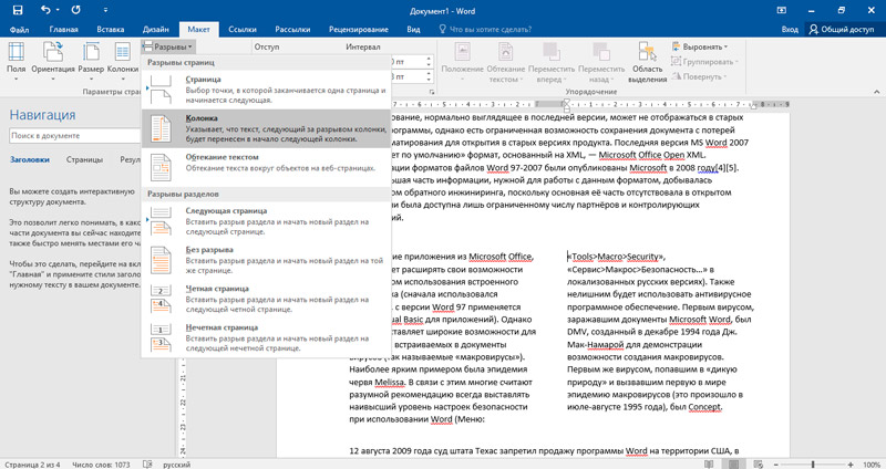 Word разрыв колонки