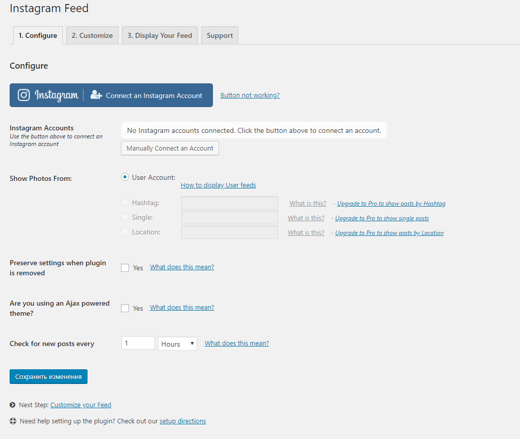 Настроек здесь больше, чем в предыдущем плагине, в то же время некоторые возможности, доступные в плагине Instagram Gallery, в этом плагине можно использовать только в Pro (платной) версии. В отличие от других плагинов, в этом плагине у вас обязательно должен быть доступ к аккаунту (то есть фотографии из чужого инстаграма выводить нельзя).