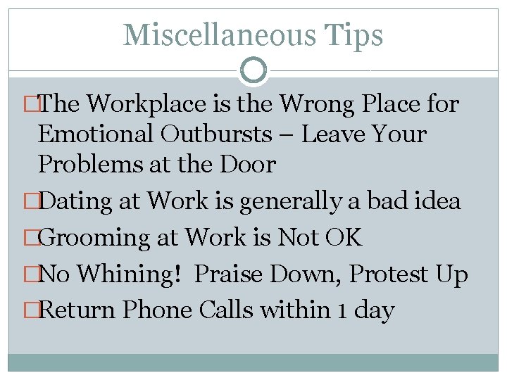 5 Rules to Dating in the Workplace . Meeting another person who shares your passion is enthralling; here is someone who's devoted to the same vocation as you, someone who also holds your great talents and unique set of skills . Add in physical attraction, natural chemistry, and seeing him or her daily, and this can lead to serious workplace . . .