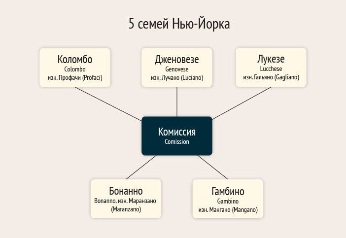К пяти семьям относятся «семьи»: Бонанно, Гамбино, Дженовезе, Коломбо и Луккезе.