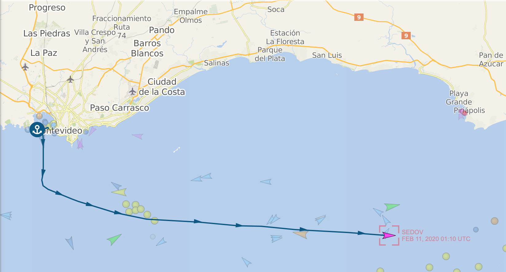 На данный момент парусник пересекает Атлантический океан из Монтевидео в Кейптаун.