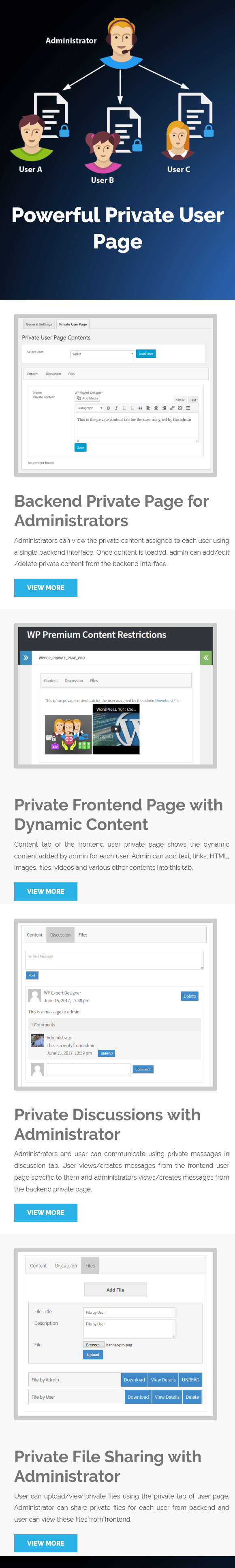 User can upload/view private files using the private tab of user page. Administrator can share private files for each user from backend and user can view these files from frontend.