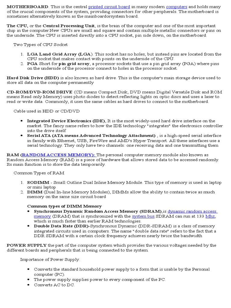 It holds together many of the crucial components of a computer, including the central processing unit ( CPU ), memory and connectors for input and output devices . The base of a motherboard consists . . .