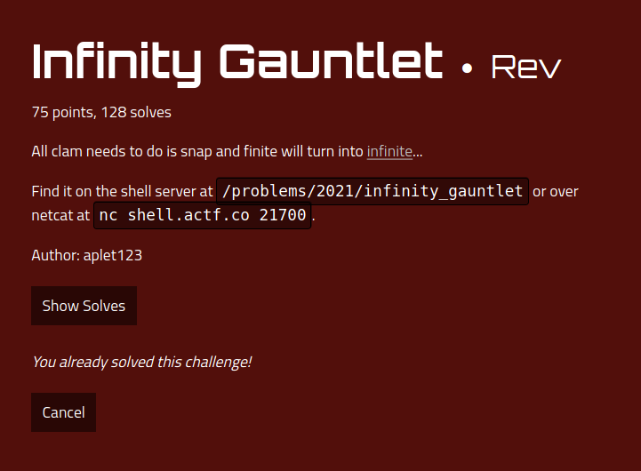 Write-up Infinity Gauntlet (angstromctf)