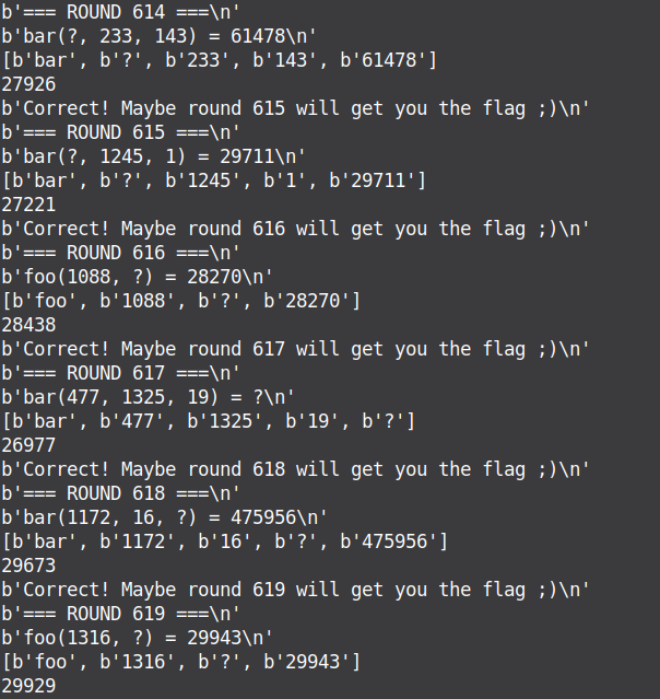 And then (after round 50) in the low byte of the correct answer there is a random encrypted flag symbol. So yes, we were able to get the flag, but we have several problems: the flag is encrypted and we don't know the order in which the received bytes make up the flag. But, but if you look at how the random works in this binary, you can understand that since its seed is set as time(0) => you can restore the sequence of the received random numbers => restore the flag sequence.