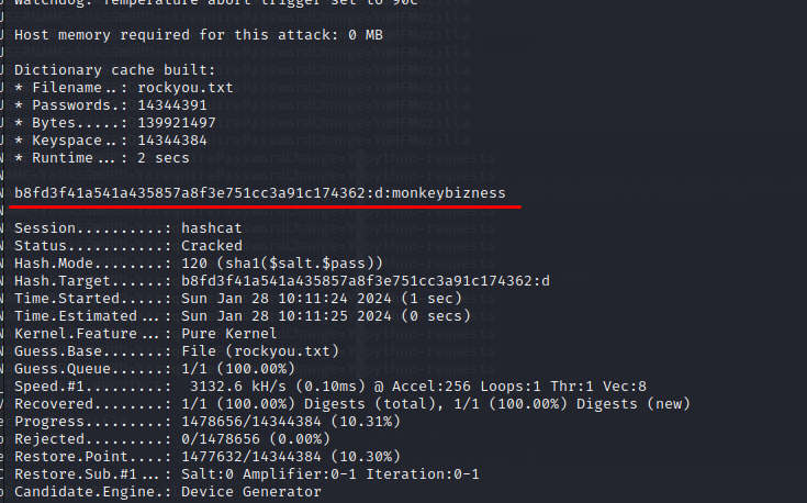 Нам нужен режим SHA1 и солью (в нашем случае соль d), это будет режим 120 из примеров hashcat.