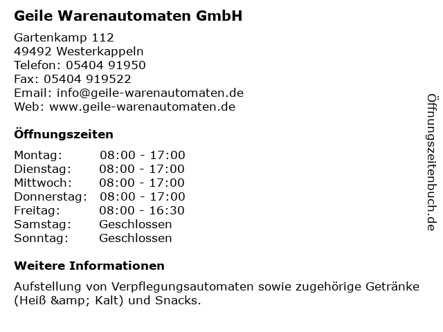 Geile Warenautomaten GmbH . Gartenkamp 110/112 49492 Westerkappeln Tel . +49 (0) 54 04 / 91 95 - 0