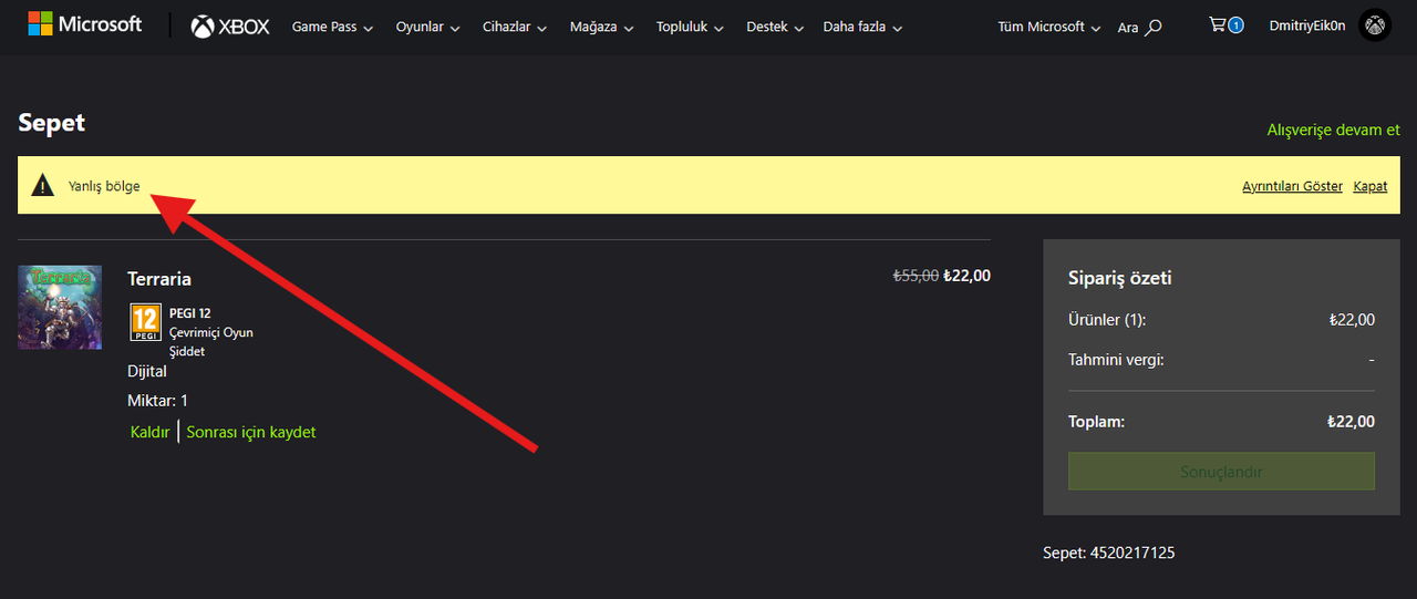 4. Если у вас появляется текст на жёлтом фоне — ваш аккаунт имеет региональное ограничение, и покупать в дешёвых регионах не получится.