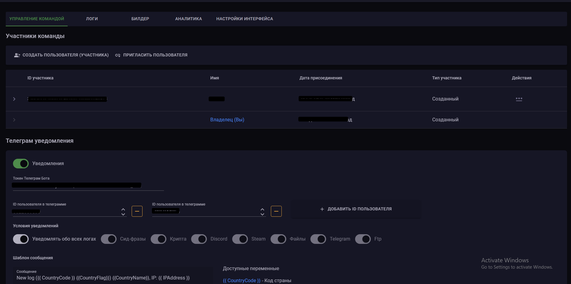 ✦ Configurar notificaciones en Telegram, con la capacidad de elegir en qué registros usted y/o sus participantes desean recibir notificaciones, la capacidad de crear su propio formato de registro en Telegram, puede agregar variables a su texto.