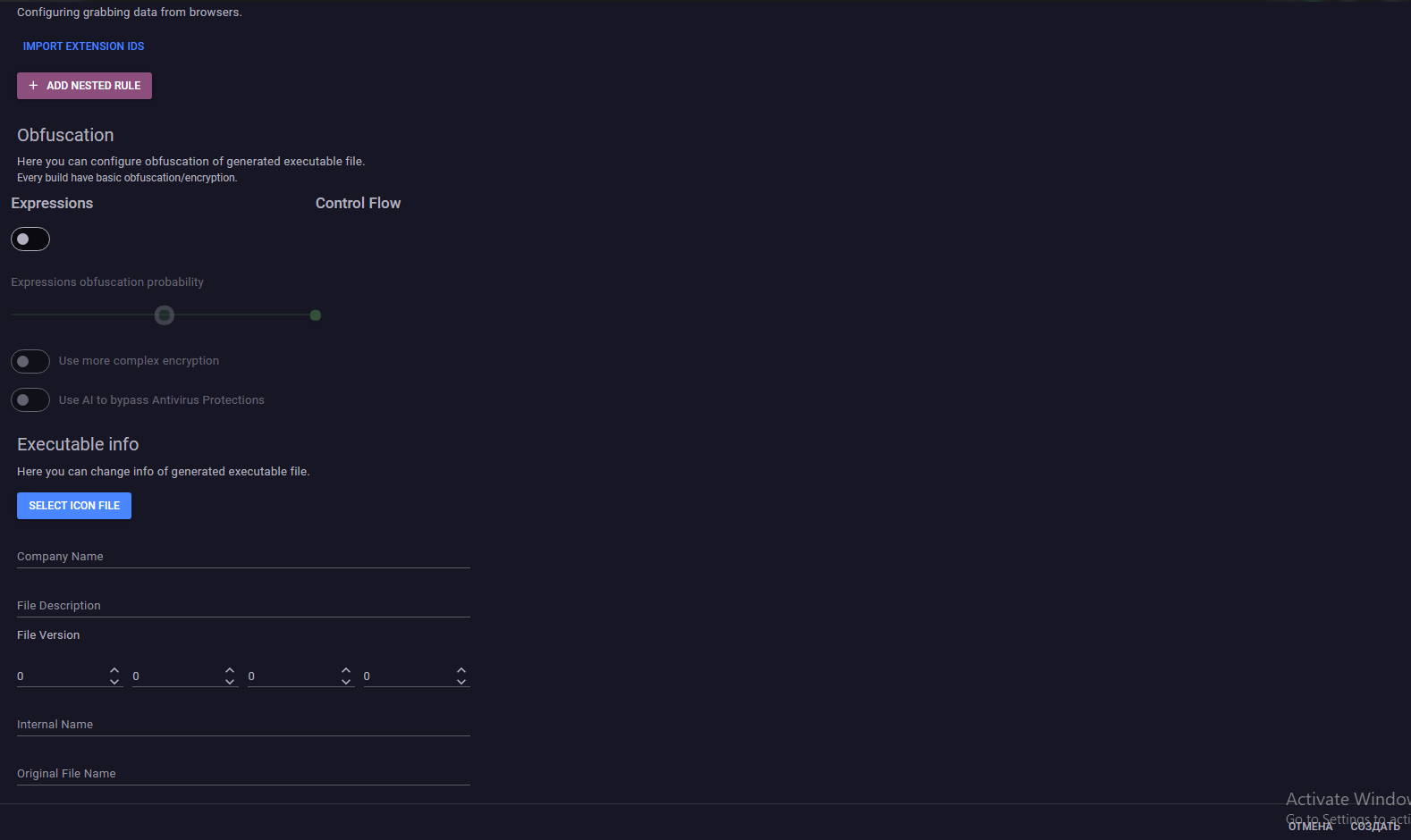 ✔ Ofuscación: puede configurar la ofuscación del archivo ejecutable generado. Cada compilación tiene ofuscación/cifrado básico.