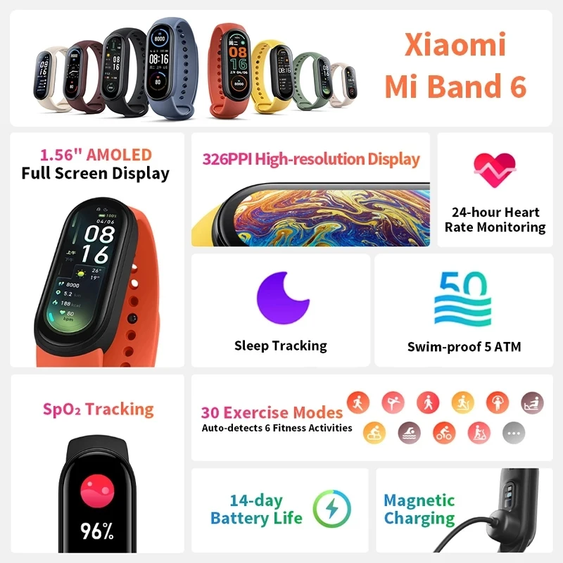 «Xiaomi Mi Band 6 Smart Bracelet 5 Color AMOLED Screen Miband 6 Blood Oxygen Fitness Traker Bluetooth Waterproof Smart Band» по лучшей цене на рынке! Всего за 83$ (7885рублей)