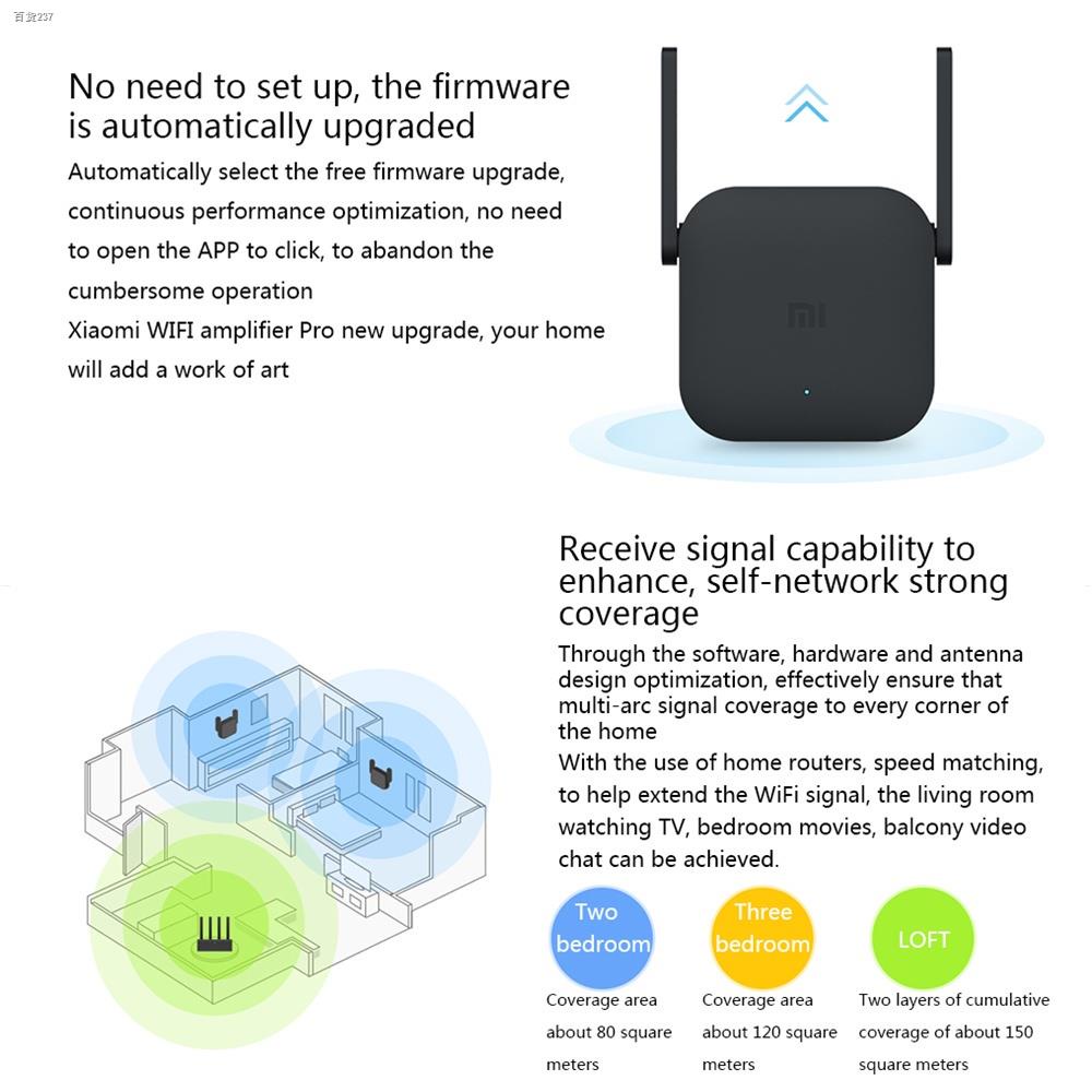 Original Xiaomi Pro 300M WiFi Amplifier for Mi Router Description: Enjoy the internet world at anytime anywhere! Our smart booster perfectly solves the problem about signal-loss and weak area connection, built-in 2 x 2dBi antenna with 300Mbps transmission speed, boost an existing wireless network throughout all your home, and say goodbye to WiFi dead zones .