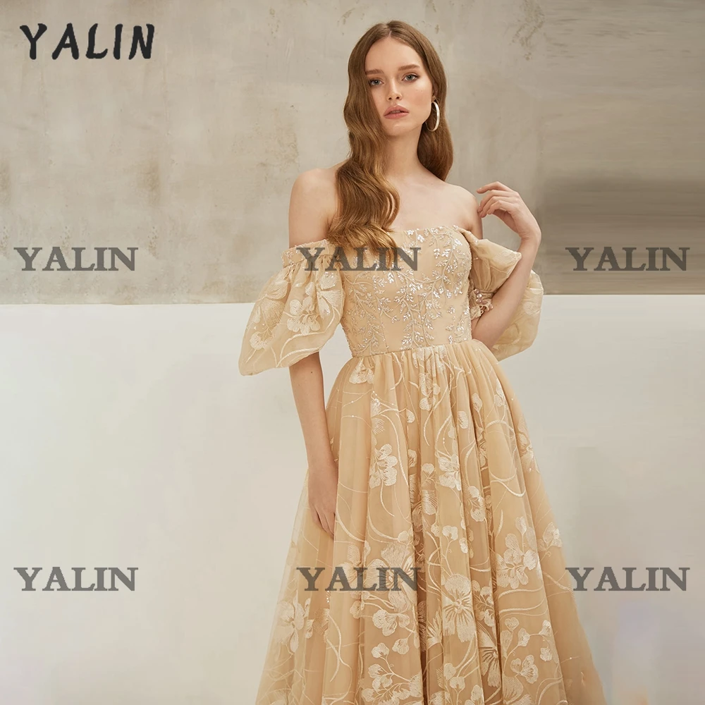 "YALIN Champagne Elegant Strapless Prom Dresses Off The Shoulder Applique Tulle A-Line Tea Length Cocktail Graduation Gowns" * Buy Now Just For 77$