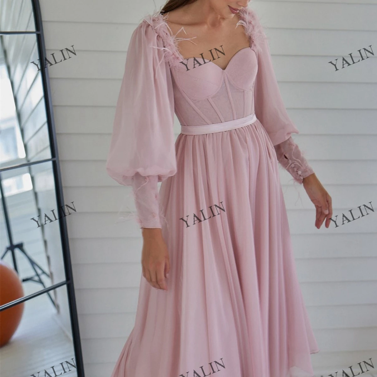 "YALIN Charming Sweetheart Neck Classmates Reunion Dress Tea-Length Princess Puff Sleeve Prom Dress Pink Feather Homecoming Gown" * Buy Now Just For 75$